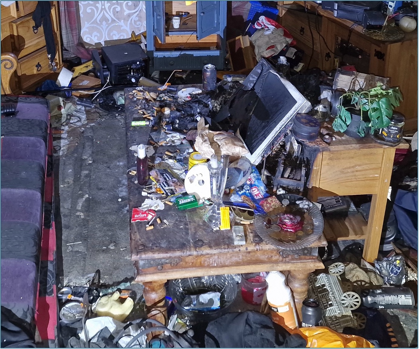 The images identify that the resident maintained poor housekeeping, with significant disorganisation and clutter throughout the living space with smoking paraphernalia on display. The NFCC report smoking is one of the top causes of accidental dwelling fires in the Uk. Nationally, it remains the top cause of accidental fire deaths. In the event of a fire, these conditions could have accelerated its spread, compromising the means of escape from the flat to a place of safety.